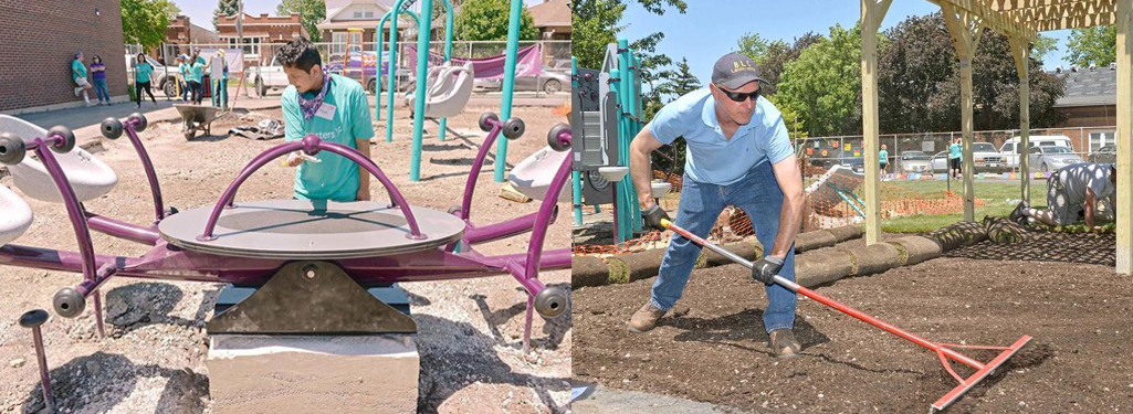 Efrain DeLatore, 12, a rising 7th grader at Freedom Middle School, cleans one of the new pieces of equipment, while Fourth Ward alderman Bob Fejt smooths the ground before turf is unrolled.